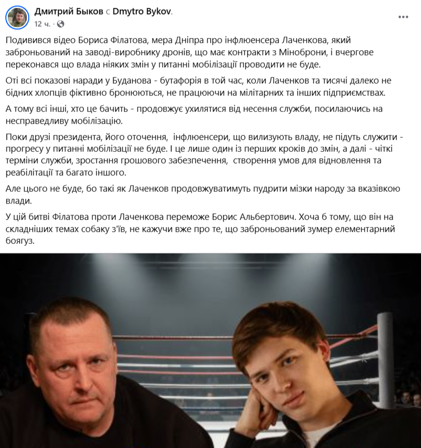 Гучна заява міського голови Бориса Філатова щодо відомого блогера Лаченкова викликала широкий резонанс у суспільстві. Нагадуємо, мер Дніпра викрив Лачена у фіктивному працевлаштуванні на підприємствах оборонного комплексу з метою ухилення від військової служби. Громадський діяч Дмитро Биков висловив своє занепокоєння щодо ситуації з мобілізацією в Україні та заявив, що «поки друзі президента, його оточення, інфлюенсери, що вилизують владу, не підуть служити – прогресу у питанні мобілізації не буде», передає «Наше місто» з посиланням на фейсбук-сторінку Бикова.