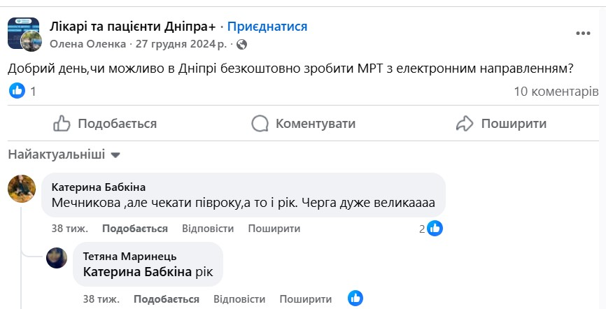 Потрапити на дослідження МРТ у лікарні Мечникова можна не раніше, ніж через рік. Про це пишуть пацієнти у коментарях в соцмережах.