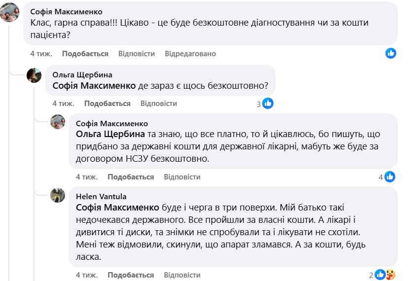 У коментарях працівники лікарні дякували за закупівлю обладнання. Водночас донька одного з пацієнтів написала, що її батько не дочекався безкоштовного обстеження, бо апарат «був зламаний». А от пройти обстеження за гроші, то – «будь ласка»!
