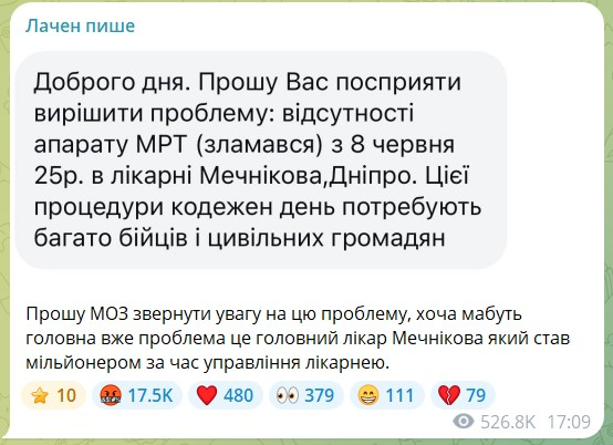 20 вересня цього року на сторінці відомого блогера Лачена у Telegram з’явилася скарга, що з початку червня у лікарні Мечникова не працює апарат МРТ.