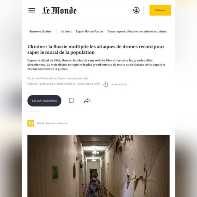 Мер Дніпра Борис Філатов дав коментар авторитетному французькому виданню “Le Monde”, яке опублікувало статтю про російський терор українських міст. На прикладі Дніпра матеріал “Le Monde” висвітлює терористичну тактику РФ, спрямовану на підрив морального духу українців. Стаття супроводжується світлинами з Новокодацького району міста, який декілька тижнів тому зазнав одного з найзухваліших ударів за весь період повномасштабної війни. Про це повідомляє 49000 з посиланням на Дніпровську міську раду.