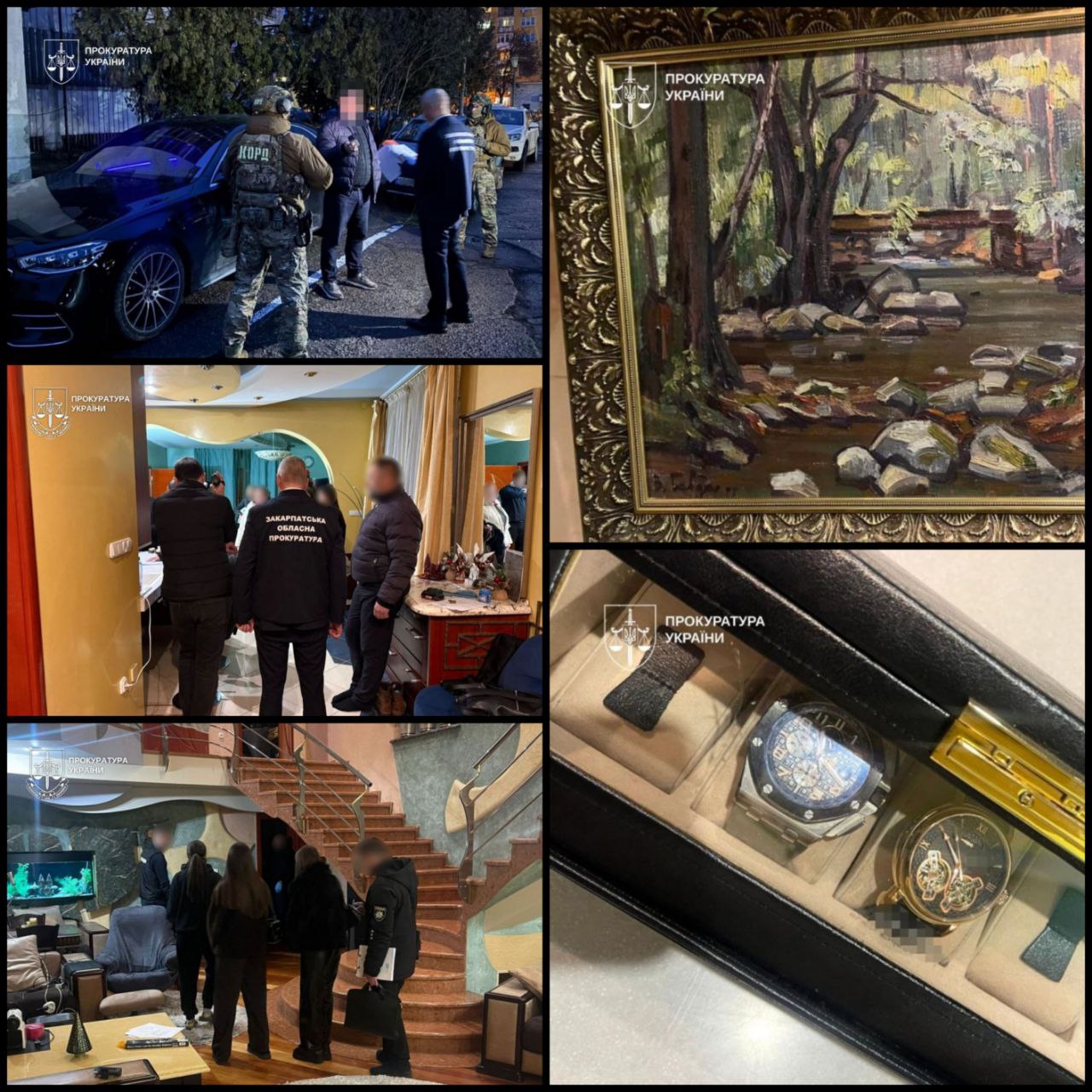 Під час санкціонованих обшуків вилучено два годинники відомих світових брендів, дев’ять картин відомих художників, автомобілі «Mercedes-Benz S-class» та «Mercedes-benz GLE» 2021 року, мобільні телефони, документи щодо оренди приміщень та готівкові кошти.