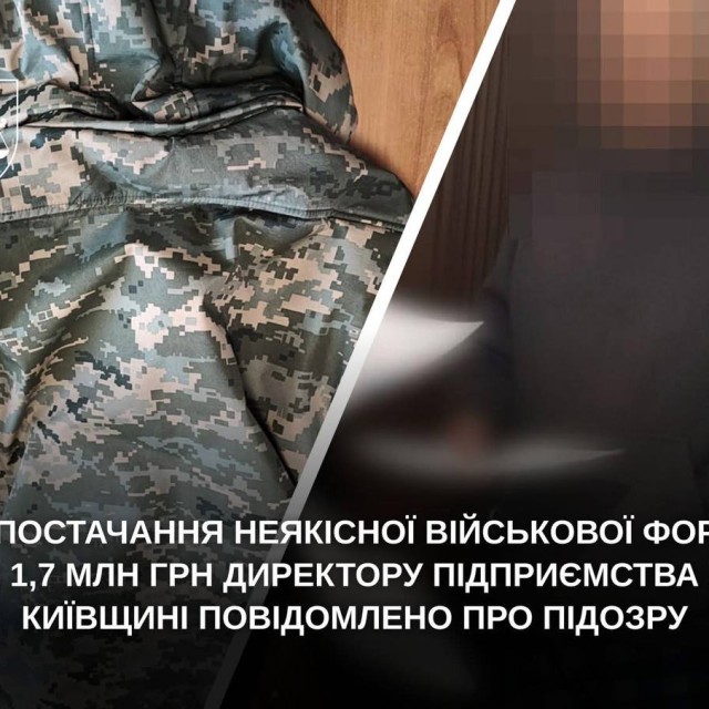 Директору приватного підприємства на Київщині повідомлено про підозру у привласненні бюджетних коштів на суму майже 1,7 мільйона гривень. Фігурант поставив Білоцерківській міській раді неякісну формену одежу, призначену для добровольчого формування територіальної громади (ДФТГ), видавши її за товар, що повністю відповідає вимогам. Про це повідомила Білоцерківська окружна прокуратура. Підозрюваному загрожує до 12 років позбавлення волі з конфіскацією майна. Про це повідомляє 49000 з посиланням на Київську обласну прокуратуру.
