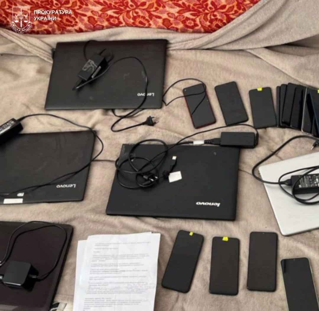 Під час обшуків вилучено комп’ютерну техніку, мобільні телефони, банківські картки, формений одяг і розпізнавальні знаки правоохоронних органів Казахстану, бейджі співробітників банків та інші докази протиправної діяльності.