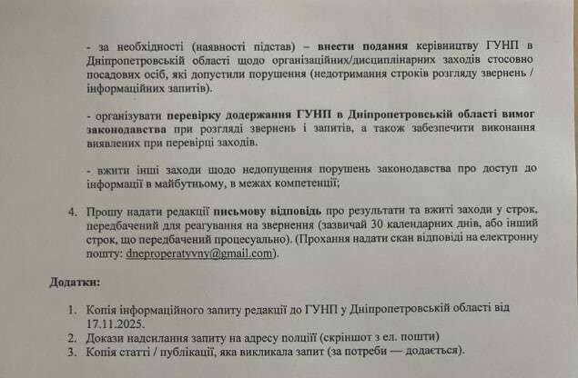 Редакція “Дніпро Оперативний” отримала відповідь від поліції щодо стрілянини 11 листопада 2025 року на проспекті Миру у Дніпрі. Однак це сталося лише після того, як ЗМІ направили скаргу до прокуратури.