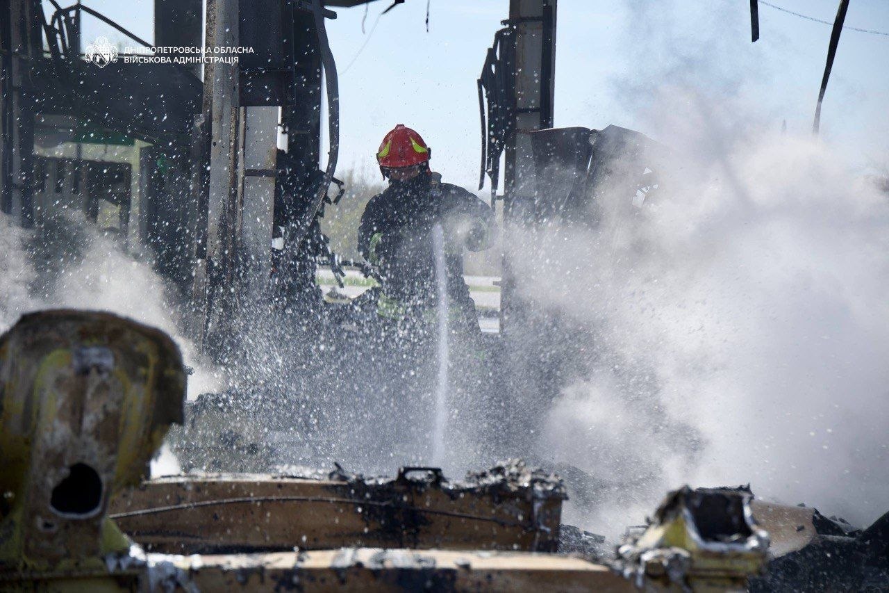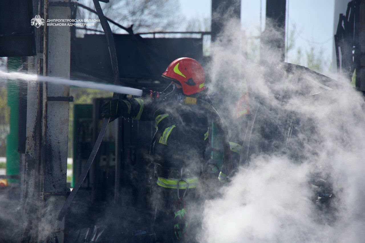 Рятувальники загасили пожежу на АЗС у Дніпрі, яка виникла через ворожу атаку сьогодні вранці. Знищені 8 вантажівок і 4 легковики, повідомляє 49000 з посиланням на Дніпропетровську ОВА.