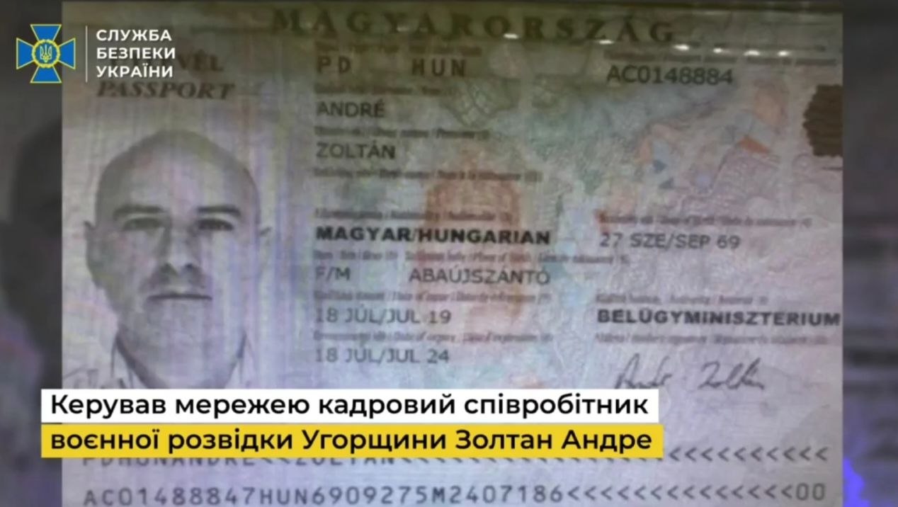 Контррозвідка Служби безпеки України встановила особу кадрового співробітника угорської воєнної розвідки, який безпосередньо керував шпигунською мережею, викритою навесні 2025 року. Організатором підривної діяльності виявився Золтан Андре. Про це повідомляє 49000 з посиланням на СБУ.