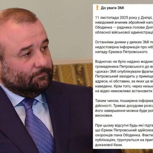 Йдеться про інцидент, що стався 11 листопада 2025 року на проспекті Миру, де невідомий вчинив збройний напад на охорону радника голови Дніпропетровської ОВА Василя Ободенка. Один з охоронців отримав вісім кульових поранень та був госпіталізований.