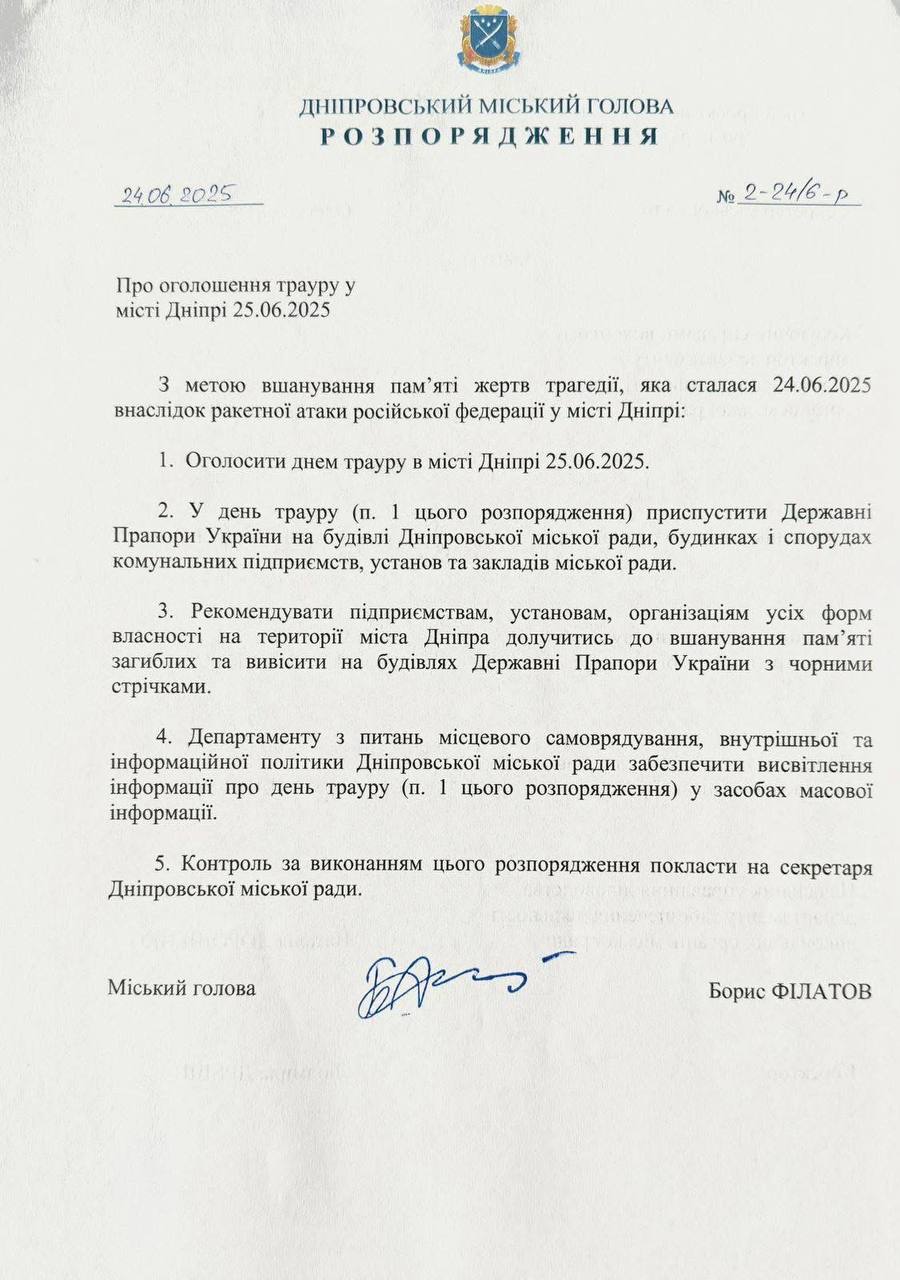 У Дніпрі у середу, 25 червня 2025 року, оголошено день жалоби за загиблими внаслідок ракетної атаки по місту вдень 24 червня. Відповідне розпорядження підписав міський голова Борис Філатов. Про це повідомляє 49000.