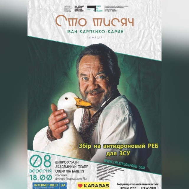 У Дніпровському Оперному театрі 8 вересня відбудеться благодійна вистава “Сто Тисяч” від Київського Театру на Подолі. Кошти, зібрані з продажу квитків, будуть спрямовані на купівлю системи РЕБ для підтримки українських захисників. Початок вистави о 18:00 за адресою: проспект Дмитра Яворницького, 72а. Про це повідомляє 49000.