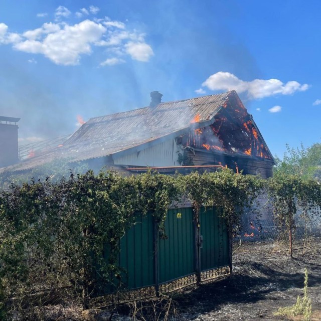 В районі пошкоджені дачний будинок, авто, лінія електропередач. Зайнялися господарська споруда і суха трава.