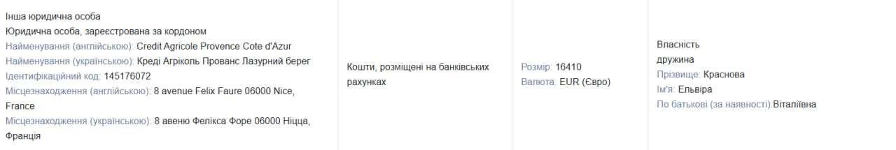 На дружину депутата зареєстрована квартира у Франції площею 65,19 кв. м, яку купили у липні 2023 року за 16 млн 048 тис. 734 грн. Адреса у декларації не вказана, але з огляду на рахунки дружини у французьких банках, один з яких Credit Agricole Provence Cote d’Azur у Ніцці, родині Краснових найпевніше могло сподобатися Лазурне узбережжя.