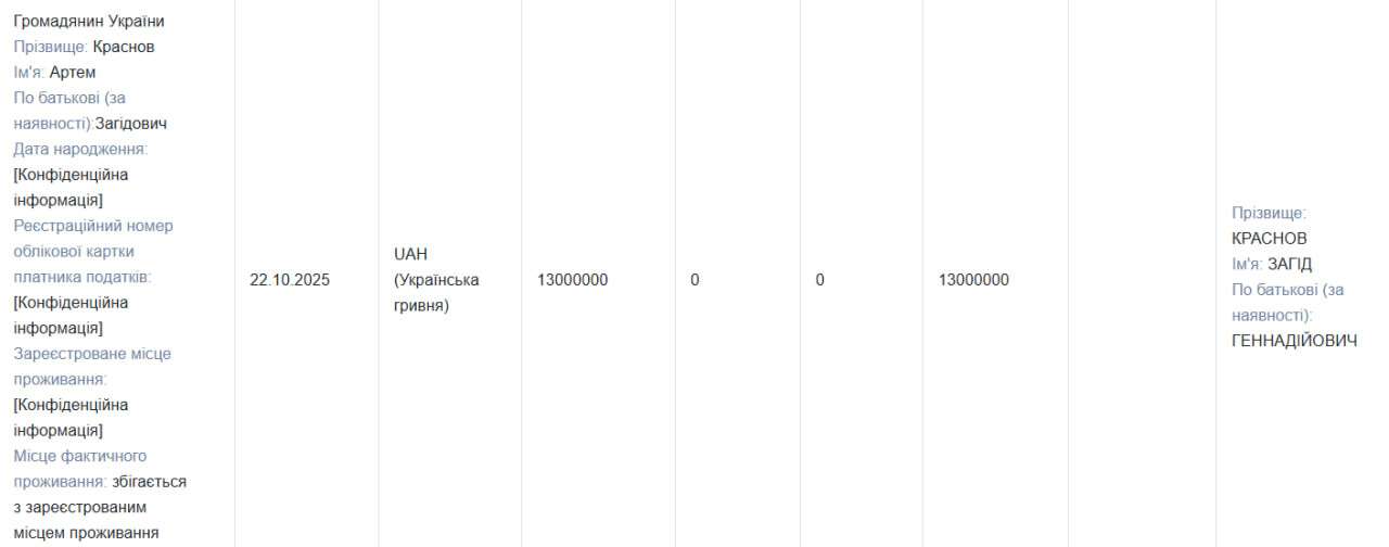 Крім того, у жовтні 2025 року Загід Краснов позичив 13 млн грн у власного сина Артема, й того ж дня депутат придбав акції на майже цю суму.