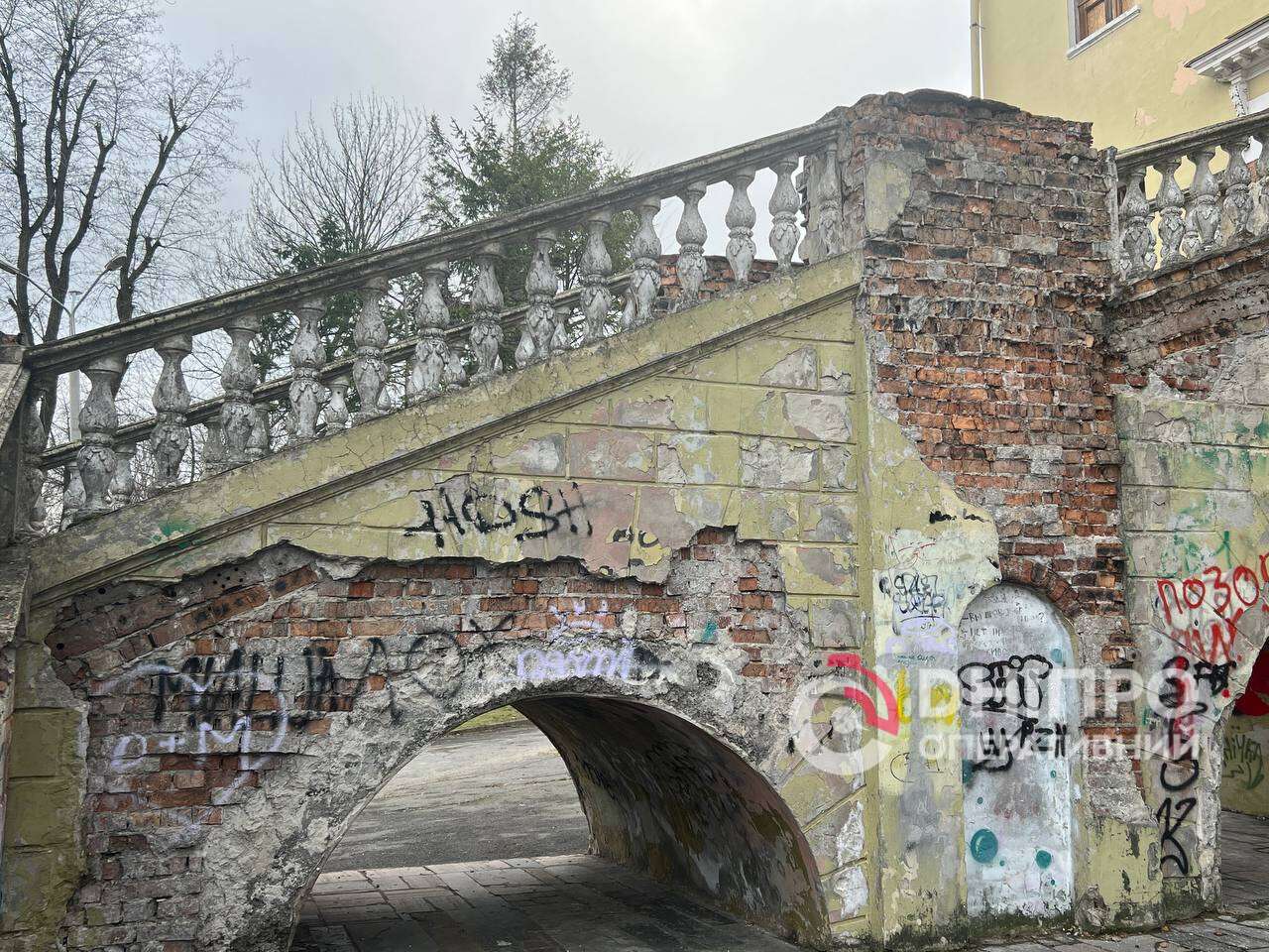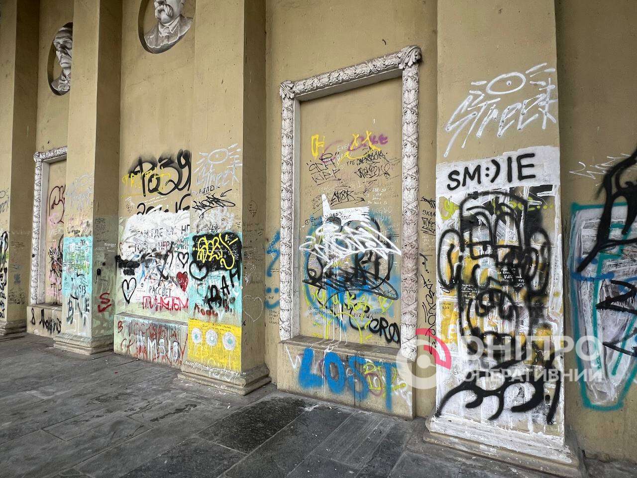 Стіни будівлі всіяні графіті, серед яких зустрічаються нецензурні написи.